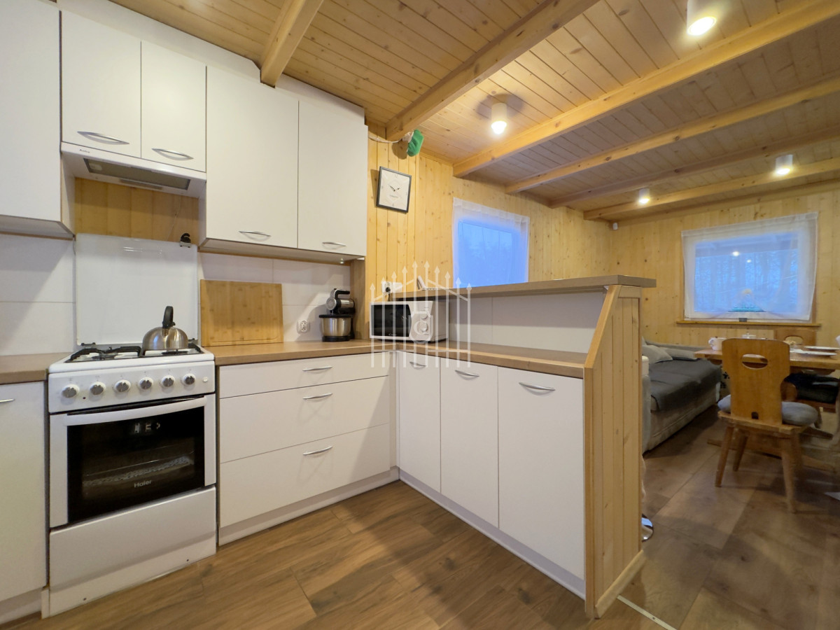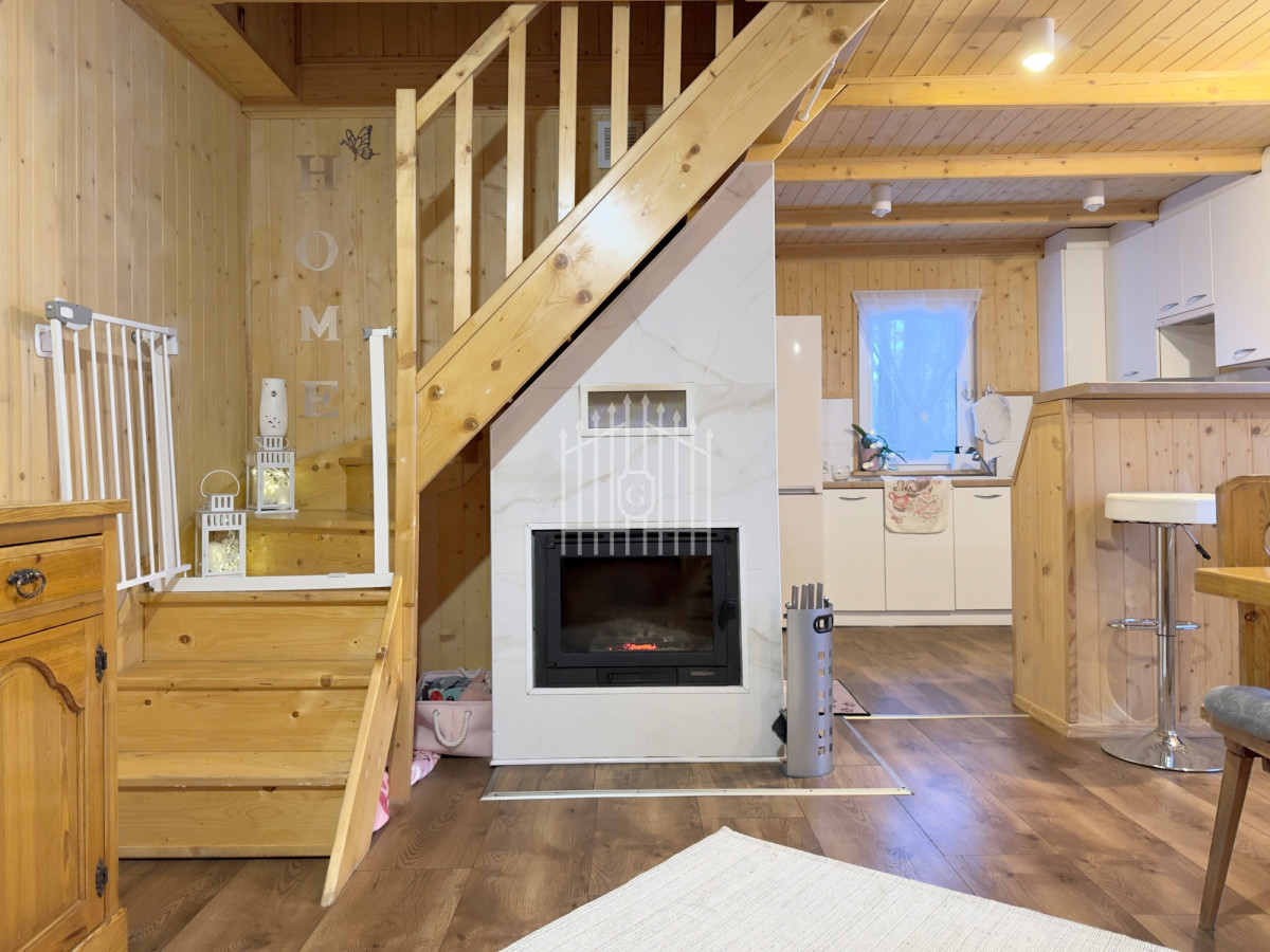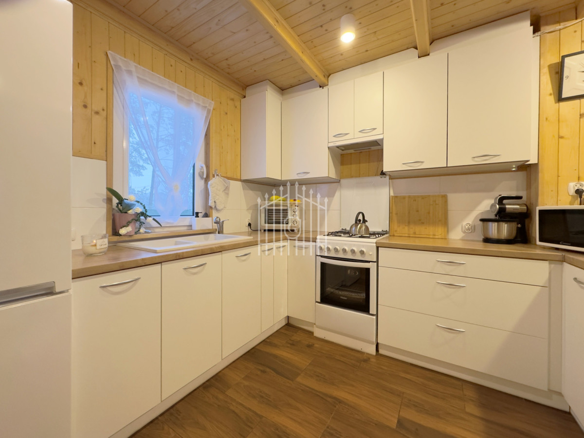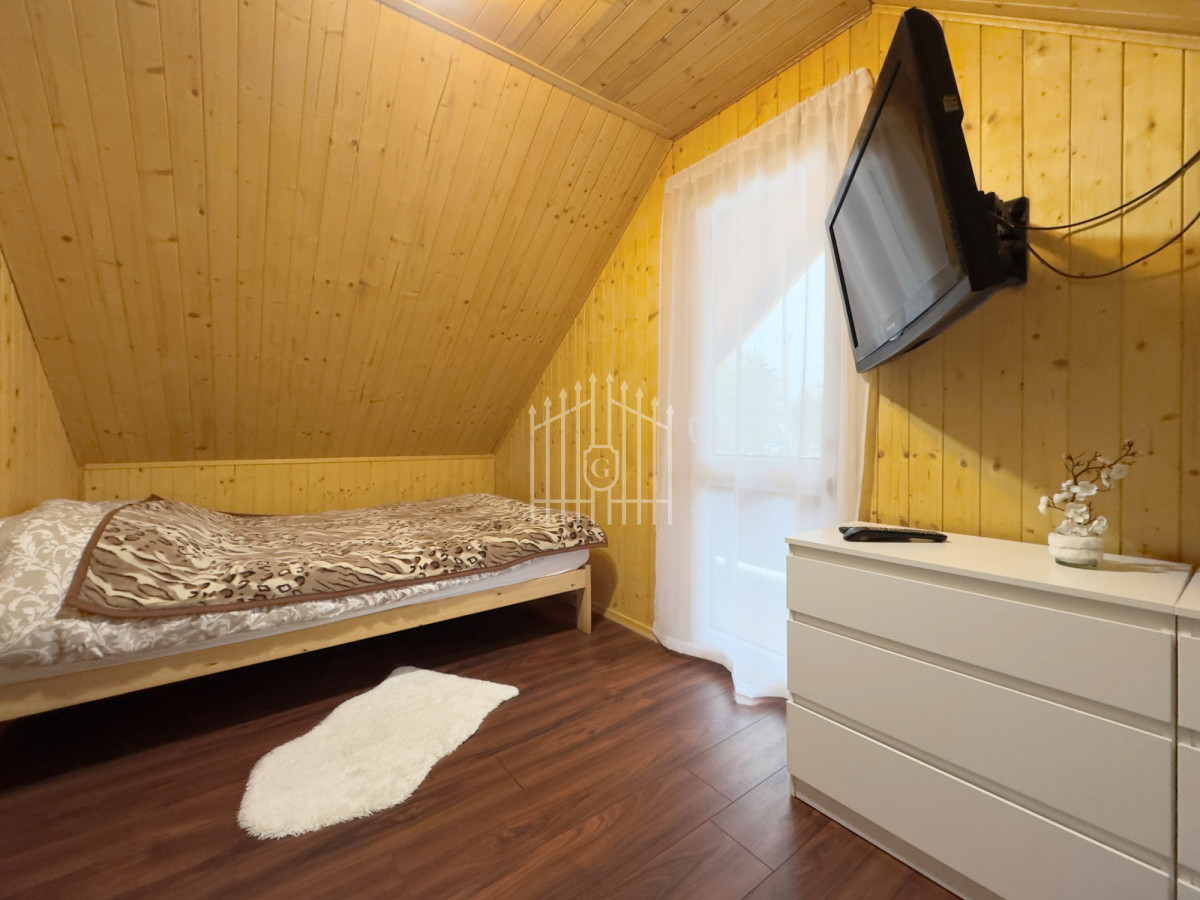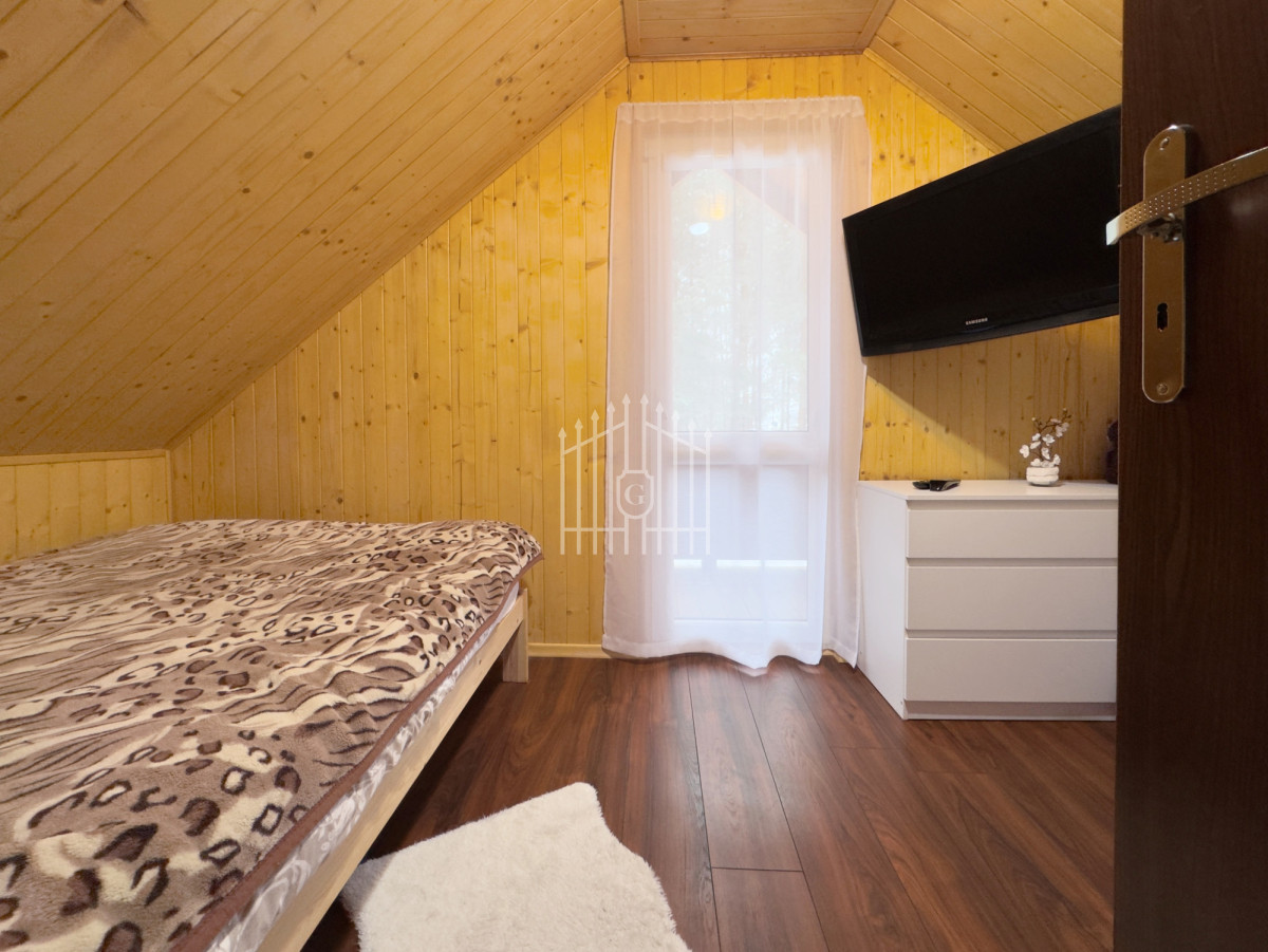 Na parterze znajduje się jasny salon z klimatycznym kominkiem, który w chłodniejsze dni dzięki nadmuchowi wypełnia całe wnętrze ciepłem i tworzy wyjątkową, domową atmosferę, duża, jasna w pełni wyposażona kuchnia oraz łazienka. Na piętro prowadzą solidne, drewniane schody, gdzie mieszczą się dwie komfortowe sypialnie (jedna z balkonem) oraz druga łazienka, zapewniająca wygodę domownikom i gościom. Wszystkie pomieszczenia są w pełni umeblowane oraz wyposażone w sprzęty AGD i RTV.