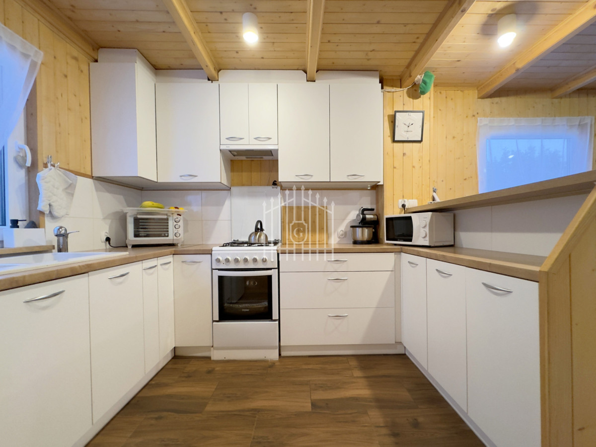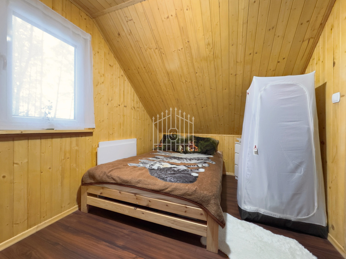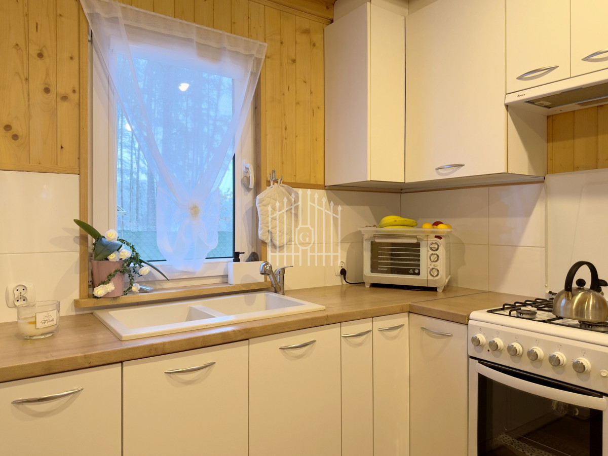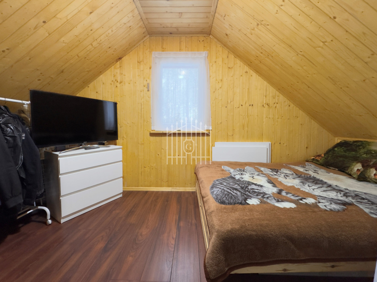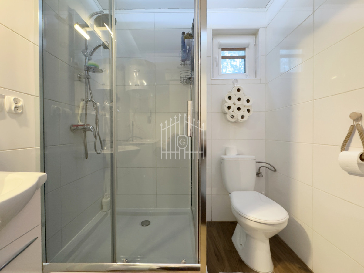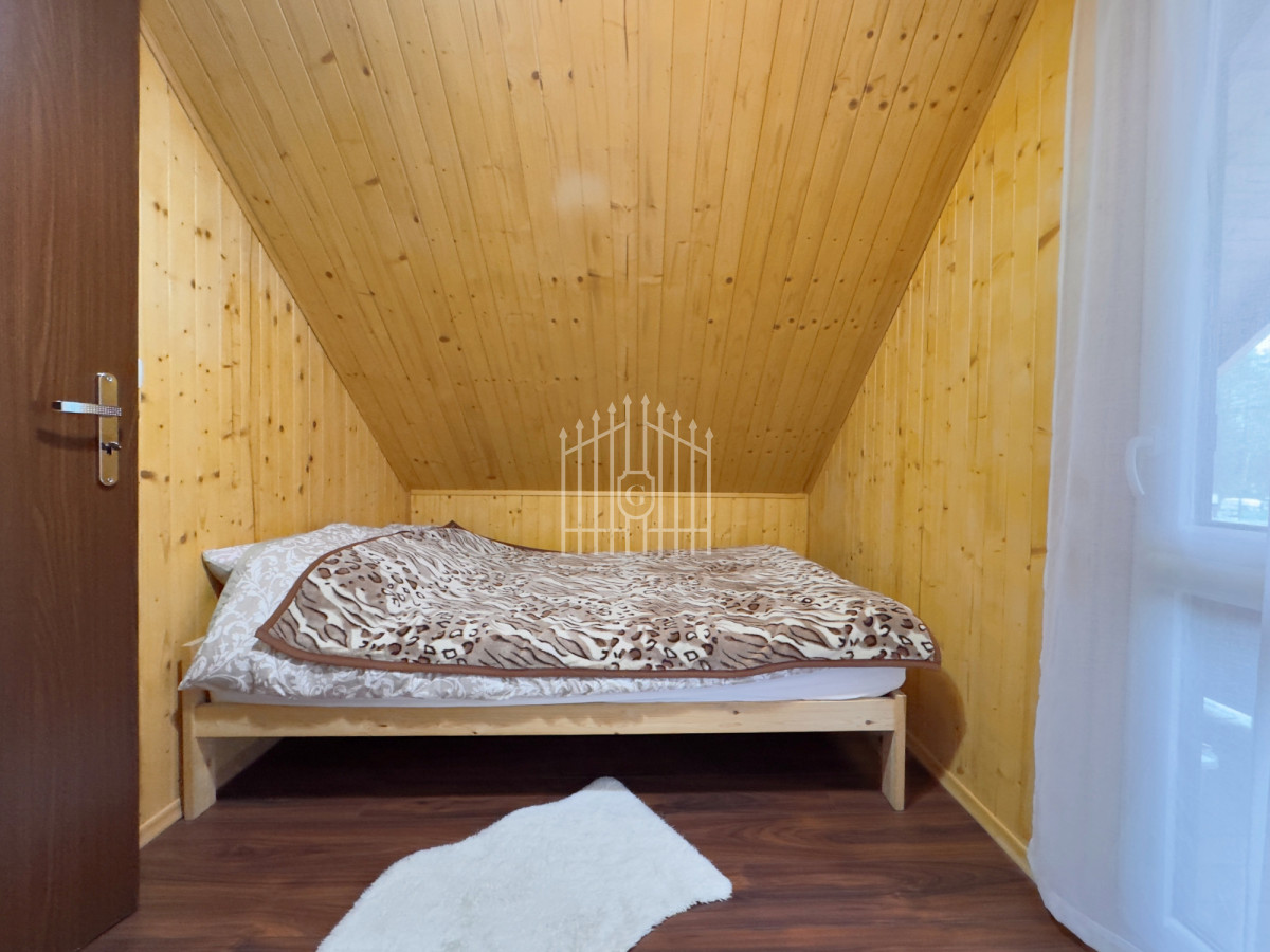 Na parterze znajduje się jasny salon z klimatycznym kominkiem, który w chłodniejsze dni dzięki nadmuchowi wypełnia całe wnętrze ciepłem i tworzy wyjątkową, domową atmosferę, duża, jasna w pełni wyposażona kuchnia oraz łazienka. Na piętro prowadzą solidne, drewniane schody, gdzie mieszczą się dwie komfortowe sypialnie (jedna z balkonem) oraz druga łazienka, zapewniająca wygodę domownikom i gościom. Wszystkie pomieszczenia są w pełni umeblowane oraz wyposażone w sprzęty AGD i RTV.