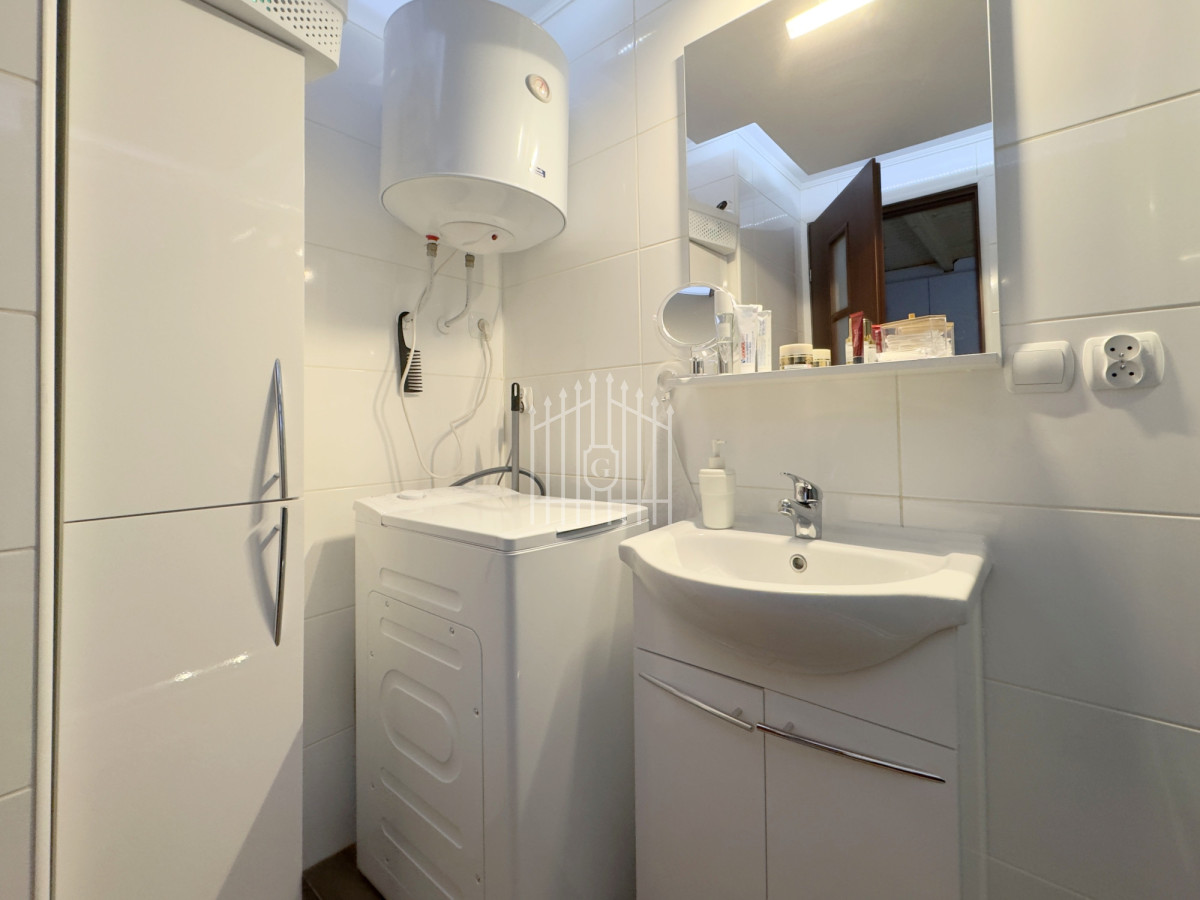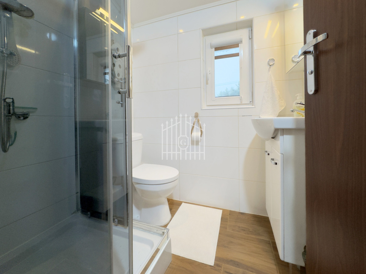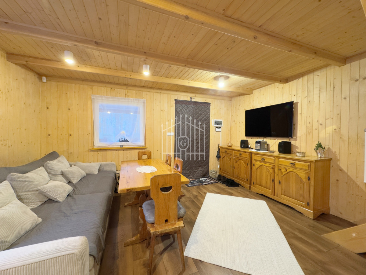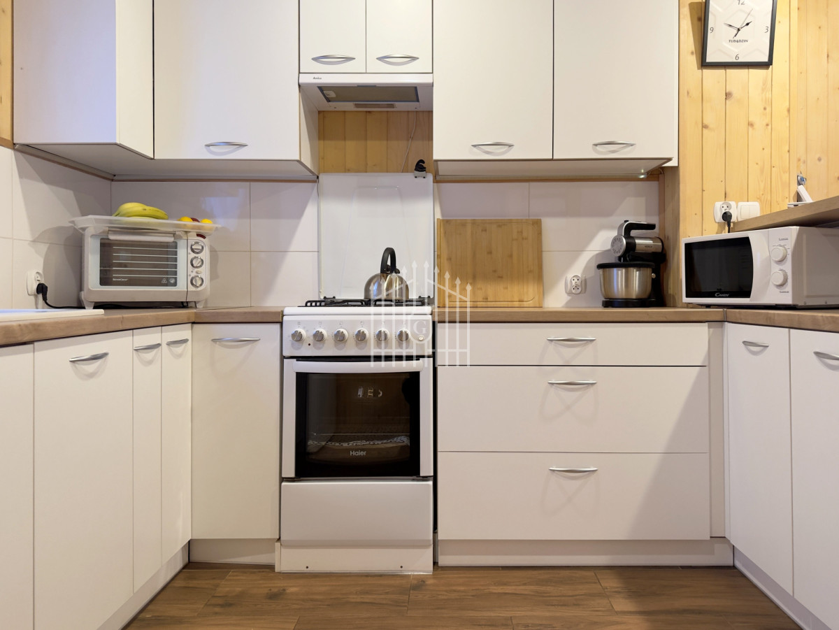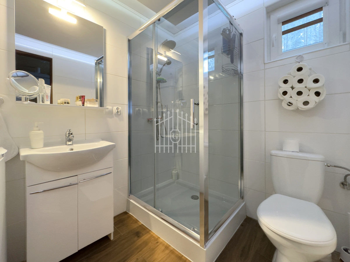 Na parterze znajduje się jasny salon z klimatycznym kominkiem, który w chłodniejsze dni dzięki nadmuchowi wypełnia całe wnętrze ciepłem i tworzy wyjątkową, domową atmosferę, duża, jasna w pełni wyposażona kuchnia oraz łazienka. Na piętro prowadzą solidne, drewniane schody, gdzie mieszczą się dwie komfortowe sypialnie (jedna z balkonem) oraz druga łazienka, zapewniająca wygodę domownikom i gościom. Wszystkie pomieszczenia są w pełni umeblowane oraz wyposażone w sprzęty AGD i RTV.