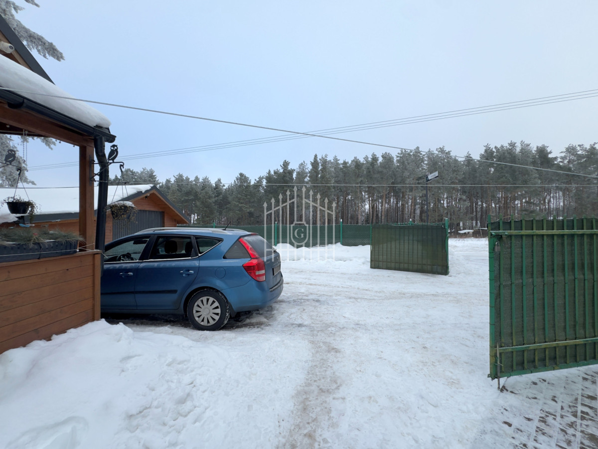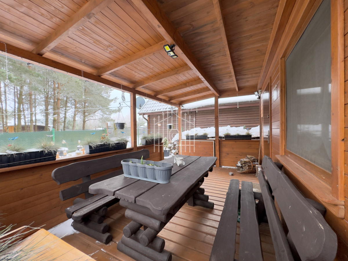 Do domu prowadzi przestronny, zadaszony taras, który stanowi idealne miejsce na poranną kawę, rodzinne spotkania czy wieczorny odpoczynek w otoczeniu natury. Na terenie posesji znajduje się również garaż z pomieszczeniem gospodarczym o łącznej powierzchni 39 m², zapewniający dodatkową przestrzeń do przechowywania.