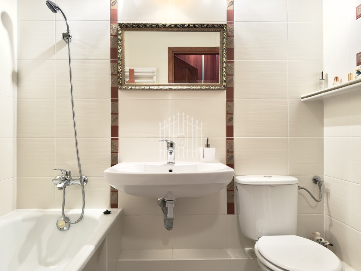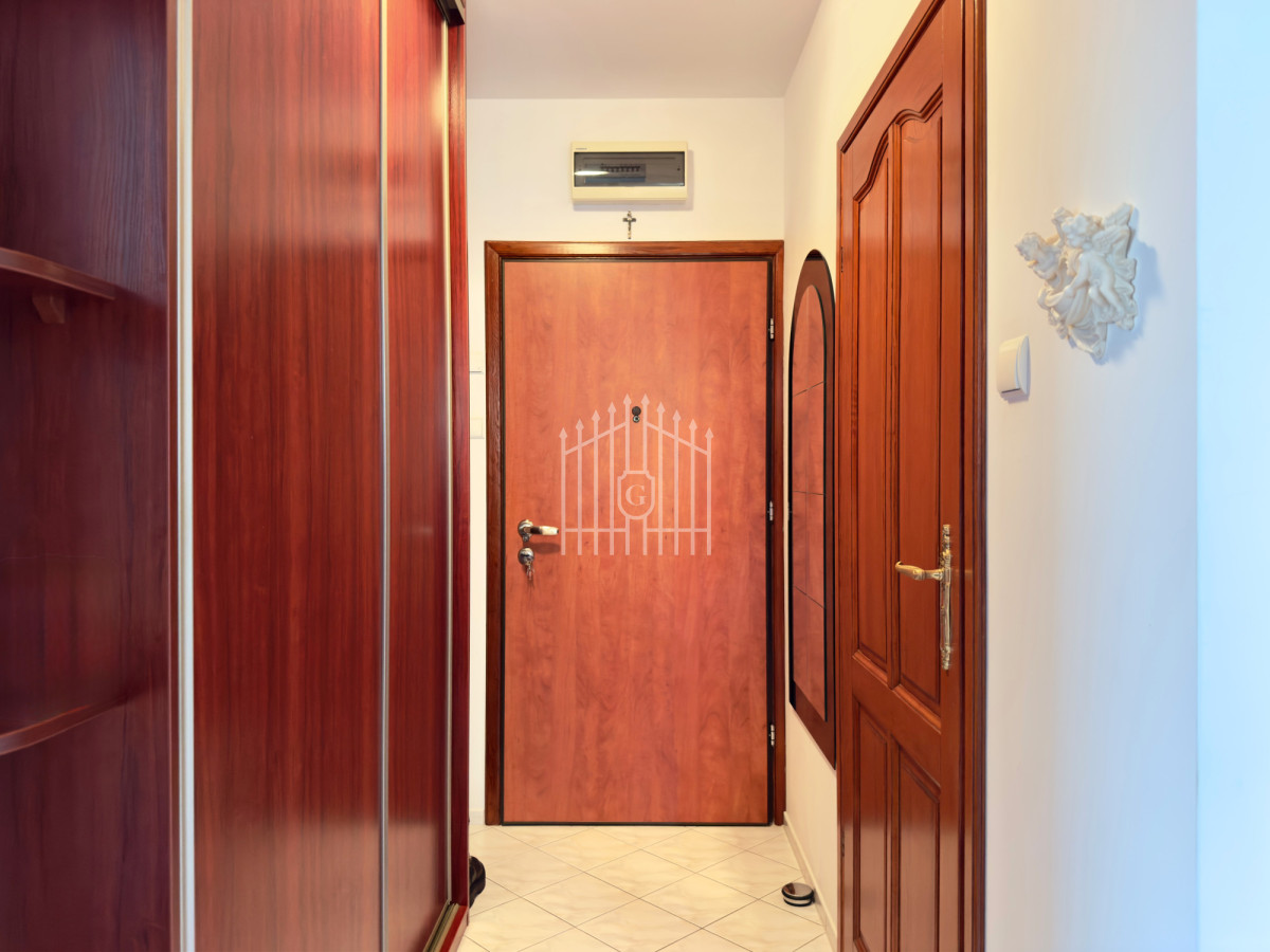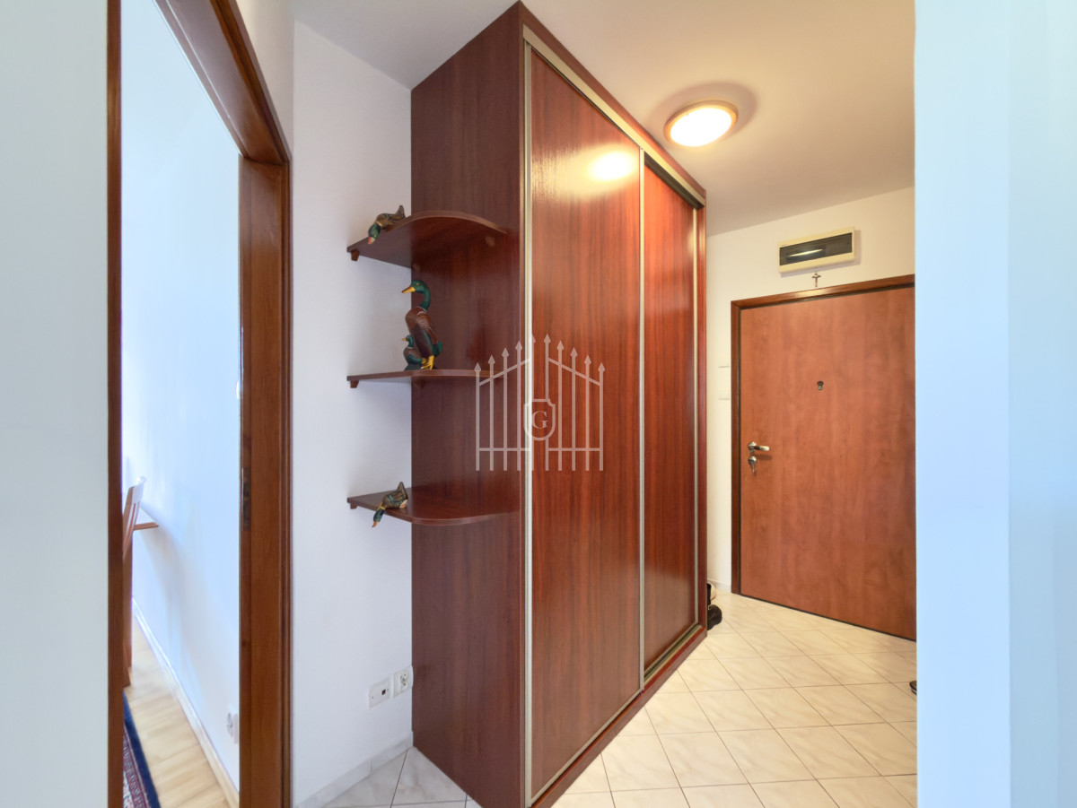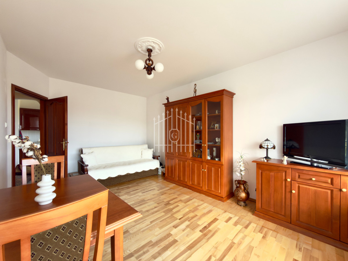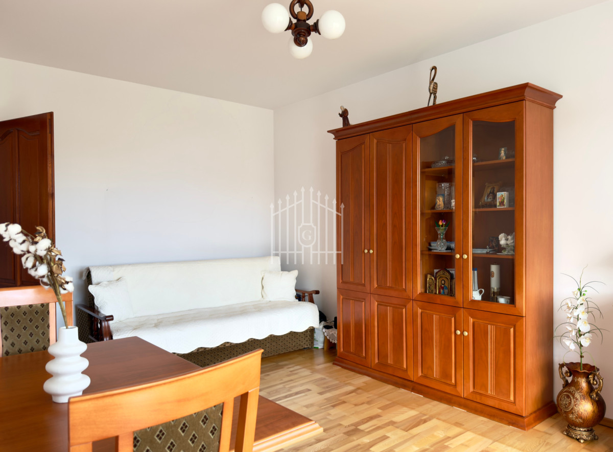 W salonie położono dębowy parkiet, który nadaje wnętrzu ciepłego charakteru. W całym mieszkaniu zamontowano drewniane drzwi. Lokal jest jasny, zadbany i funkcjonalny.