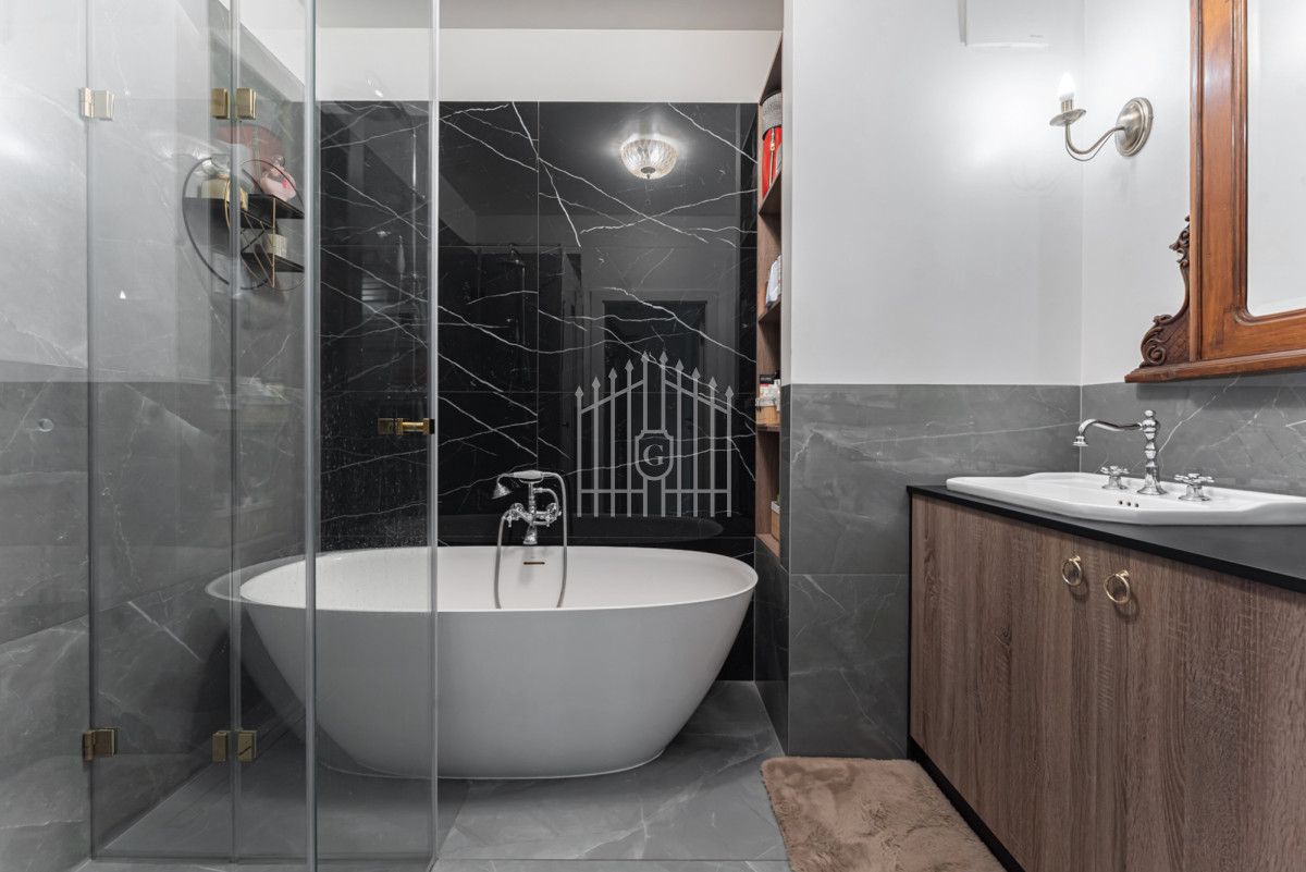 - Łazienka - przestronna, z wanną wolnostojącą, prysznicem i pełną zabudową stolarską.
