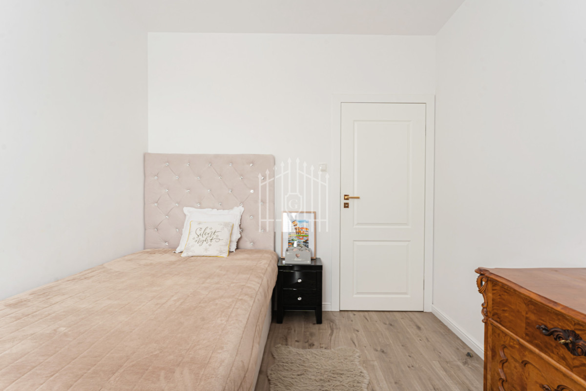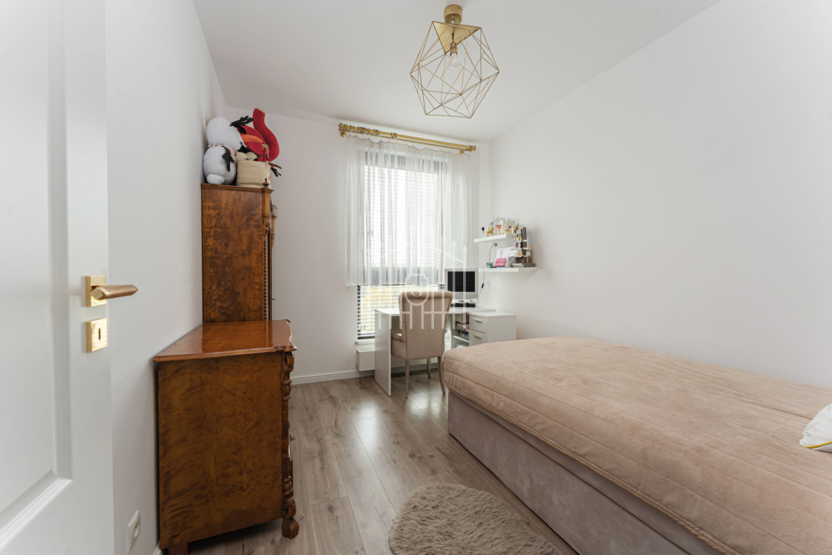 - Druga sypialnia / gabinet - wyposażona w łóżko o wymiarach 120 × 200 cm, biurko oraz półki wykonane na wymiar. Pomieszczenie może pełnić funkcję zarówno pokoju dziecka, jak i komfortowego miejsca do pracy. Wnętrze dopełniają meble z litego drewna o wyjątkowym charakterze - biblioteka i komoda, które nadają przestrzeni elegancji i przytulnego, indywidualnego klimatu.