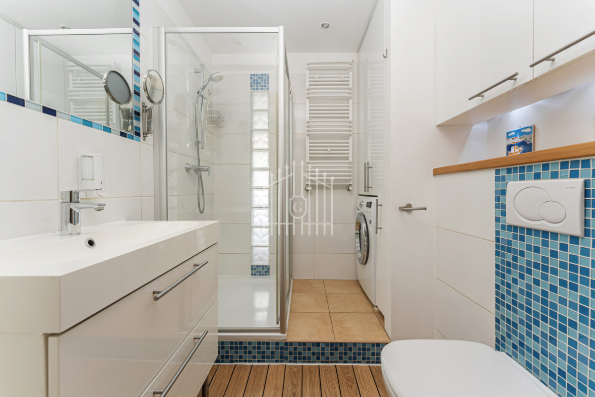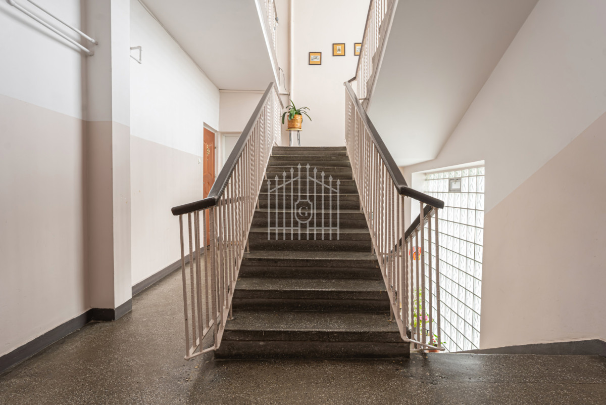Łazienka została wyposażona w kabinę prysznicową, a przedpokój oferuje praktyczną przestrzeń do przechowywania. Do mieszkania przynależy piwnica o powierzchni 5 m², a mieszkańcy mogą korzystać z ogólnodostępnej suszarni.
